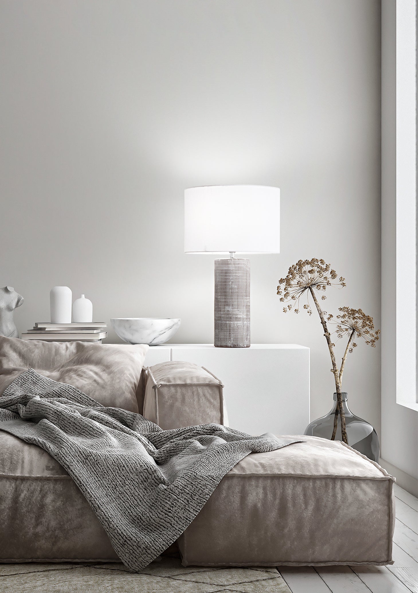 Lampada da tavolo realizzata con base in ceramica lavorata artigianalmente e paralume in tessuto bianco.