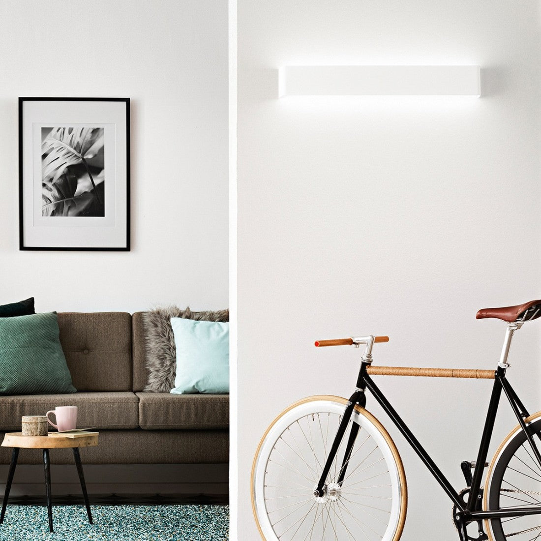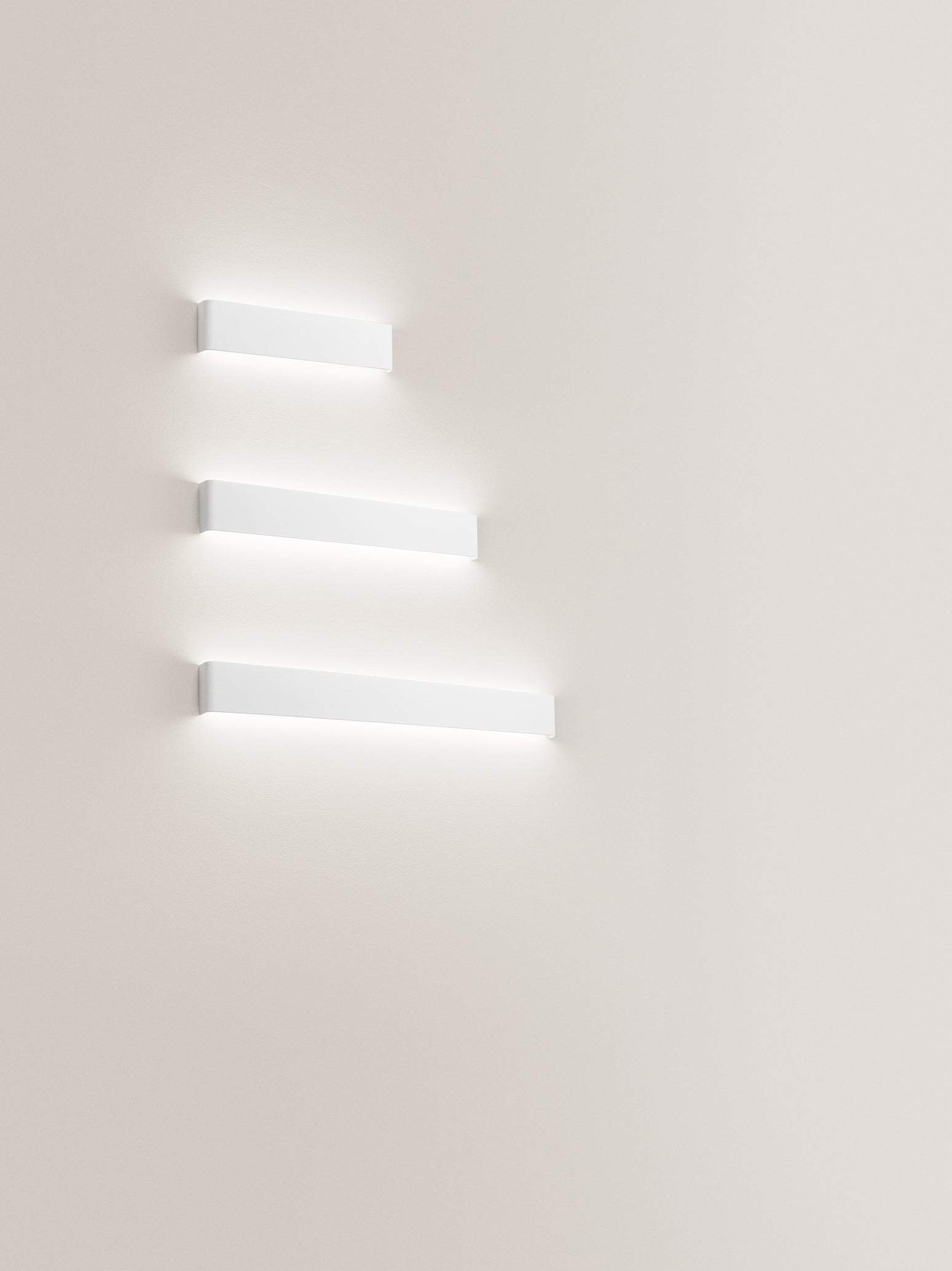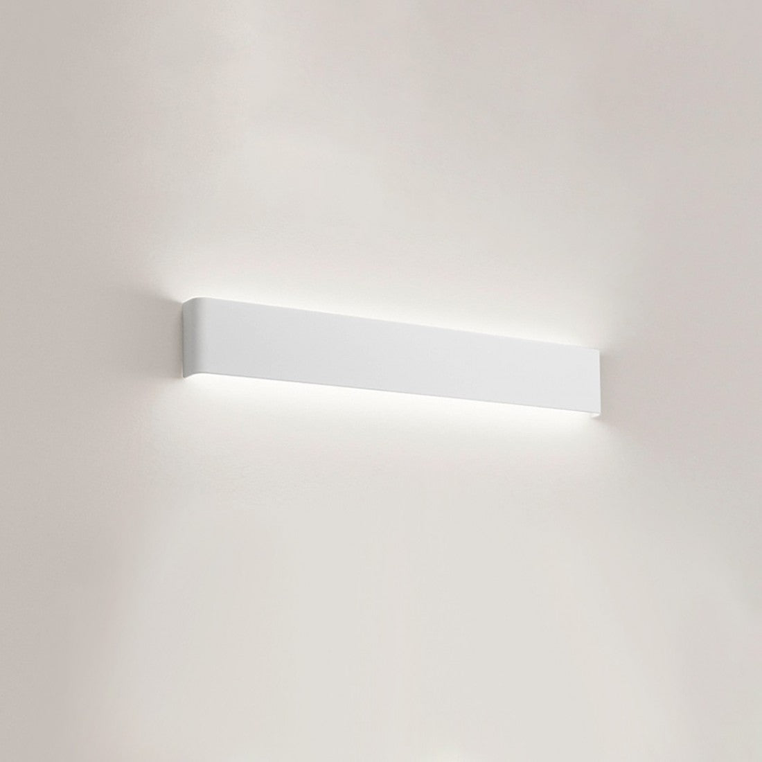 Un segno essenziale a parete, disponibile in tre misure: luce calda e uniforme per corridoi, living e ingressi.