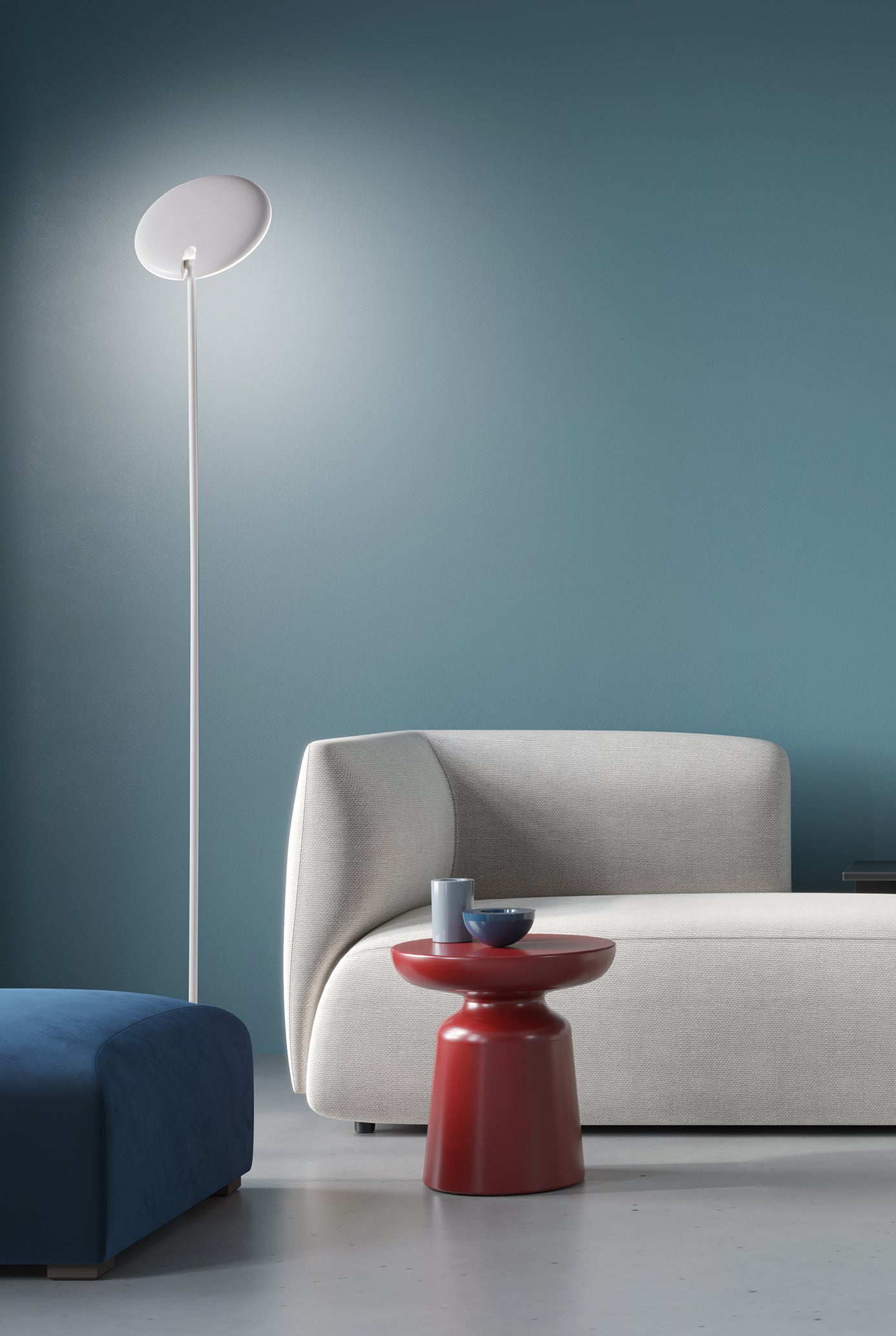 Floor lamp with a clean and contemporary line, Ophelia diffuses a soft and enveloping light thanks to its adjustable disk. An elegant minimal presence for modern environments.