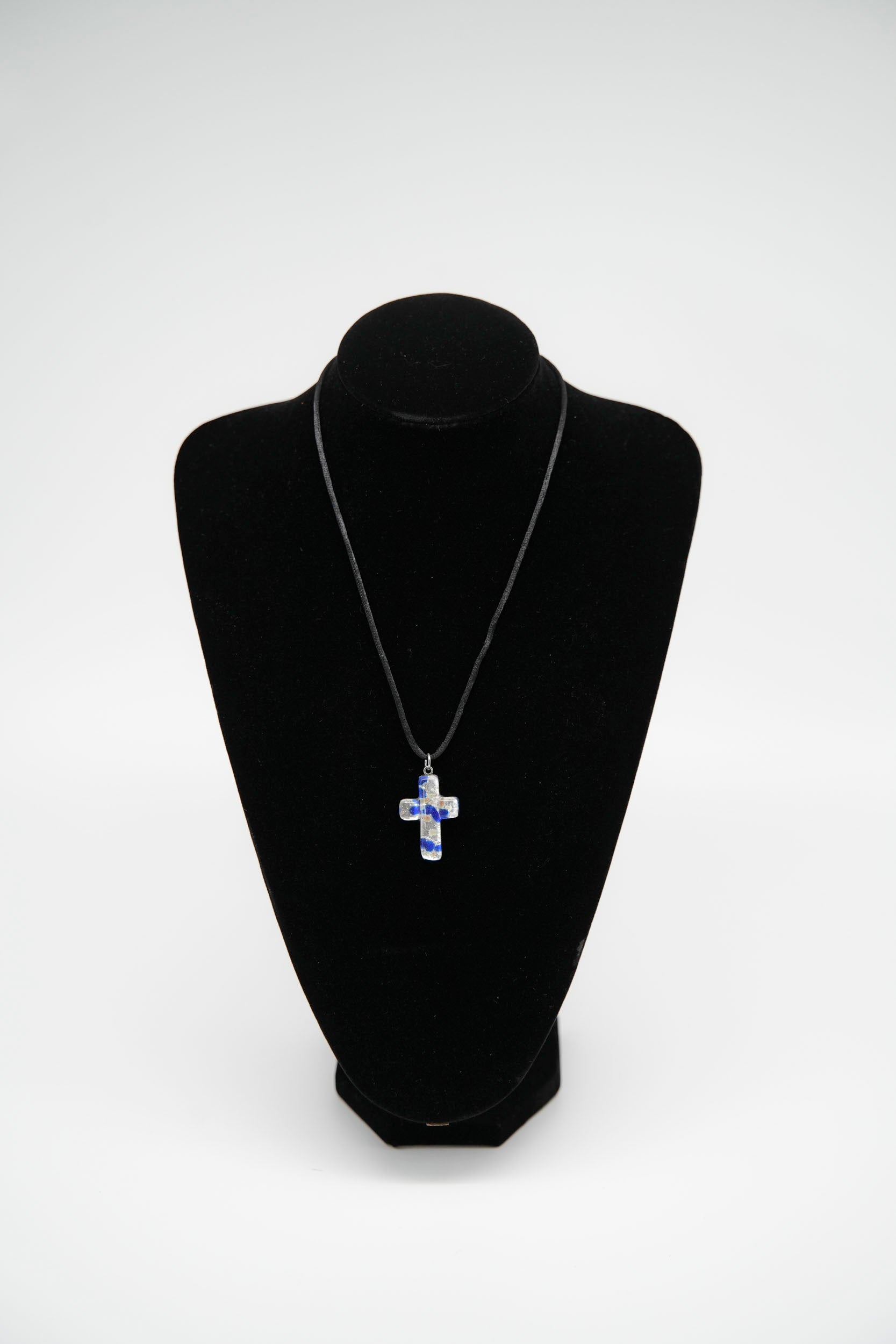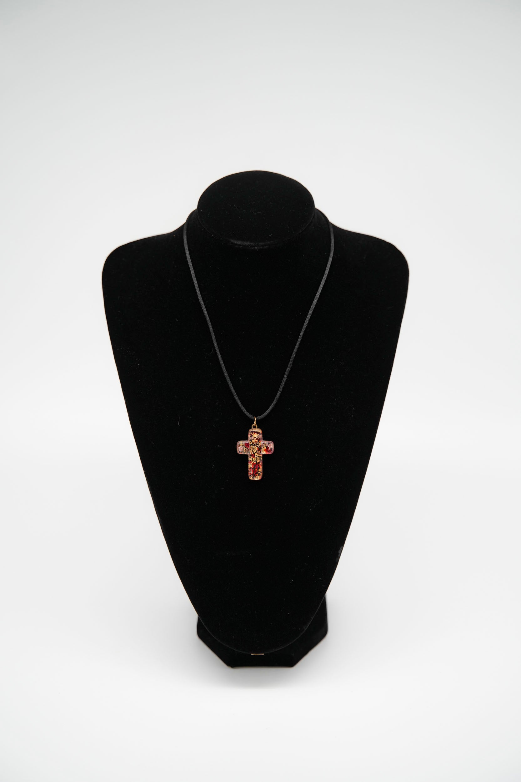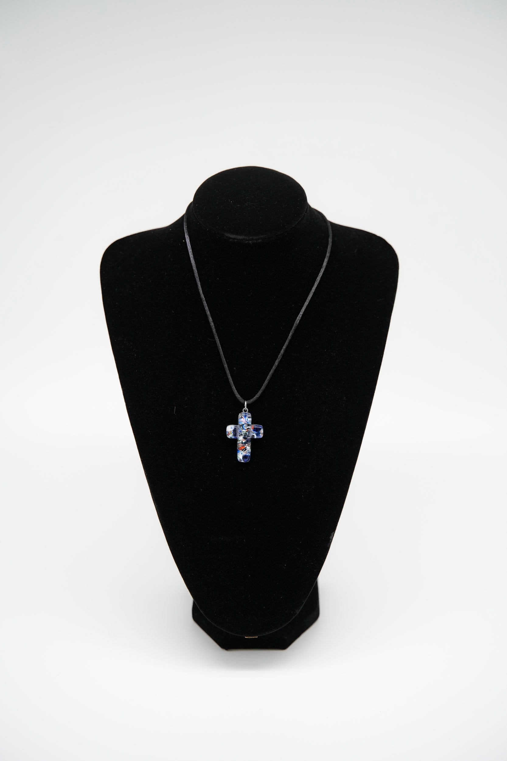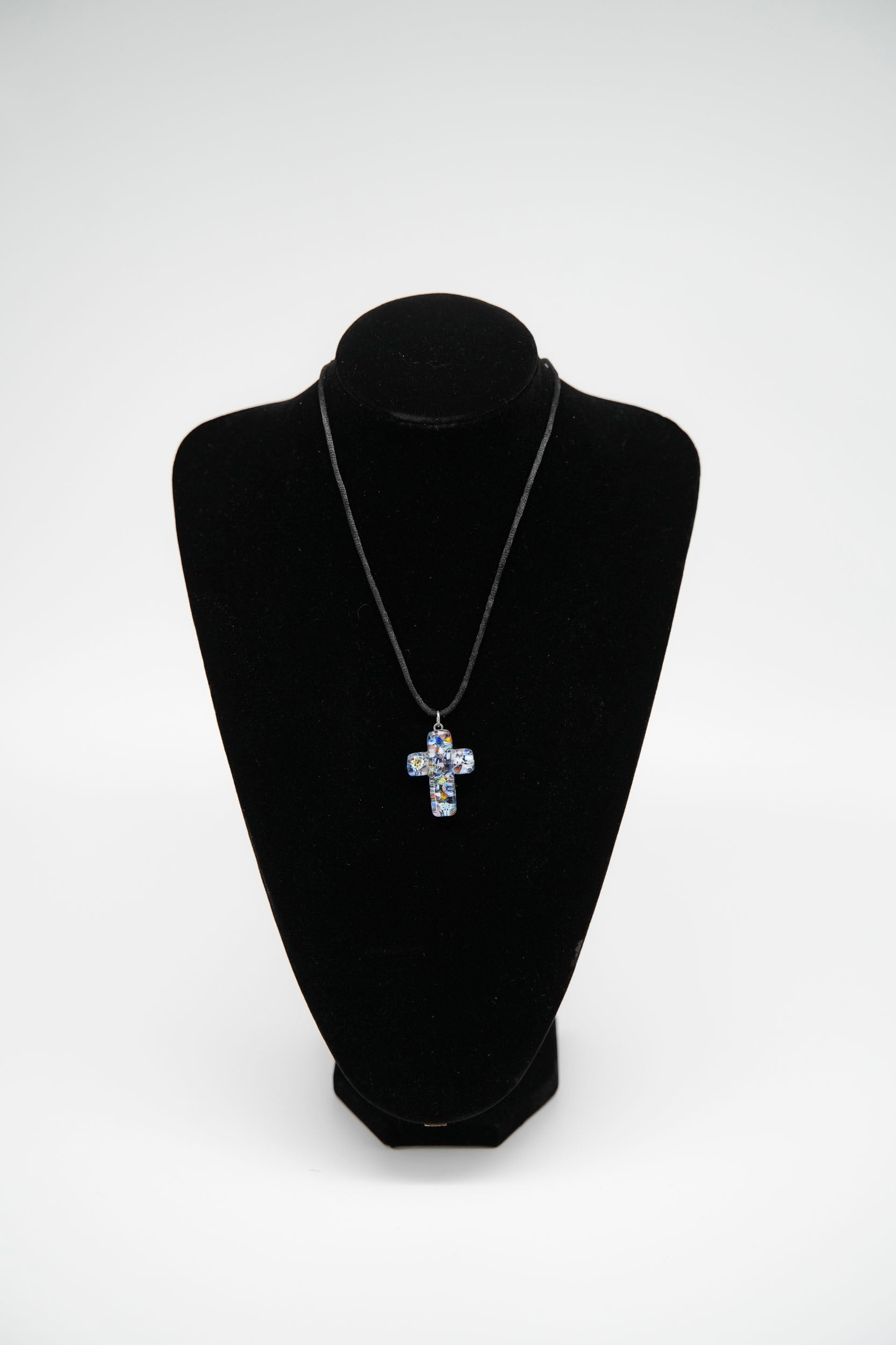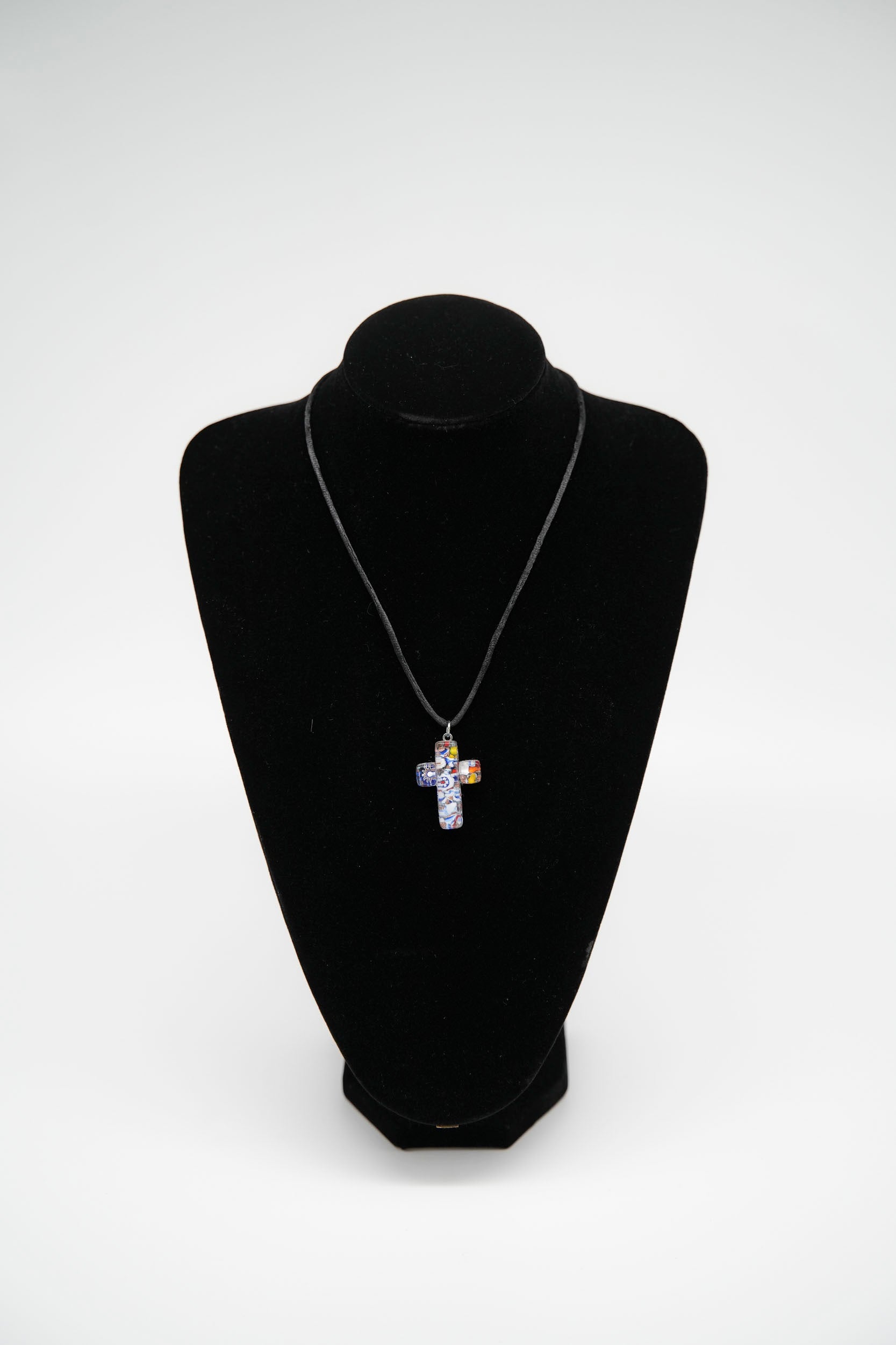 Raffinata collana con pendente a forma di croce realizzato in vetro di Murano con la tradizionale tecnica delle murrine. Ogni croce presenta un mosaico di colori e motivi unici, frutto dell’arte vetraria veneziana, che dona eleganza e originalità al gioiello. La catena leggera e resistente completa il design, rendendola perfetta da indossare tutti i giorni o nelle occasioni speciali.