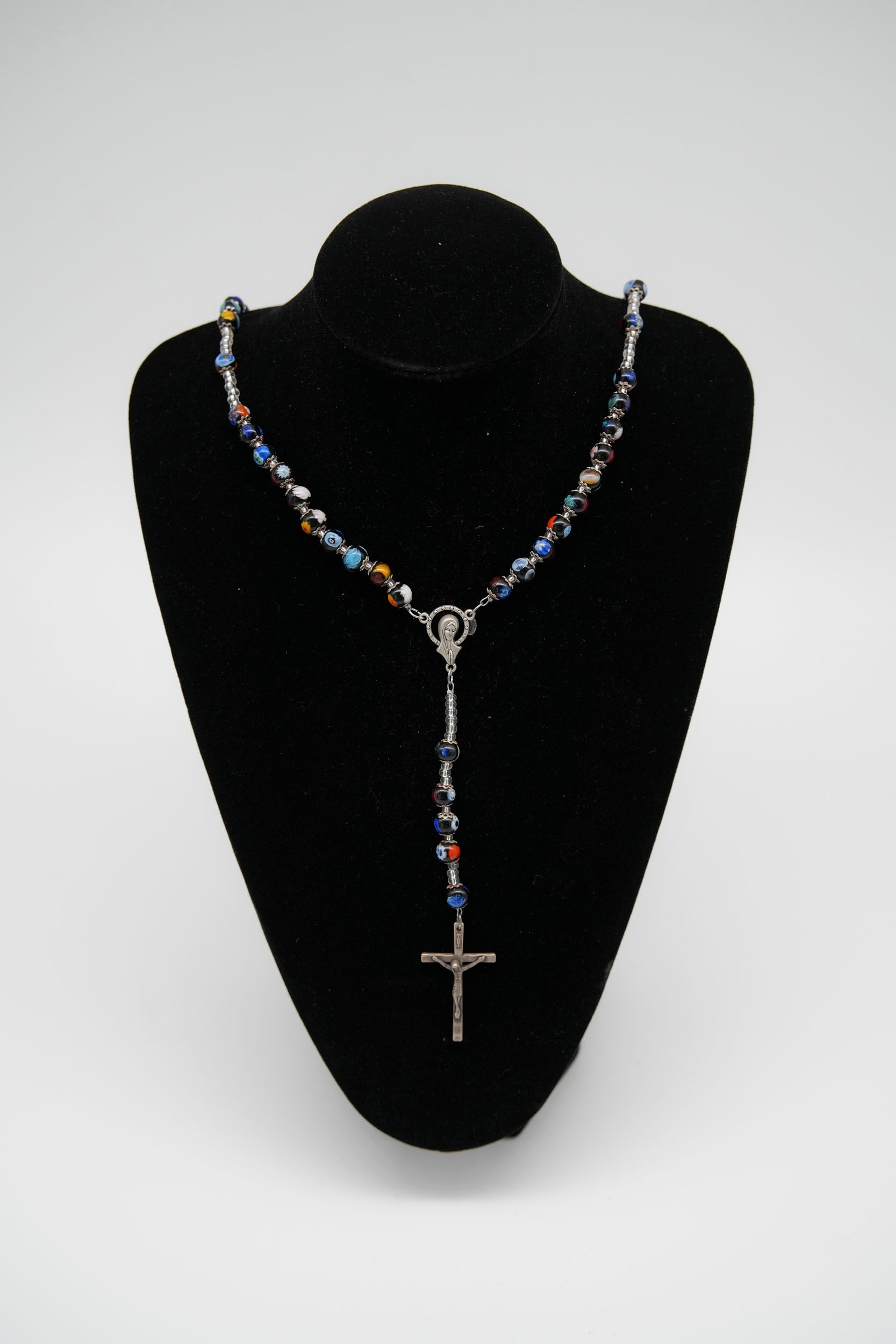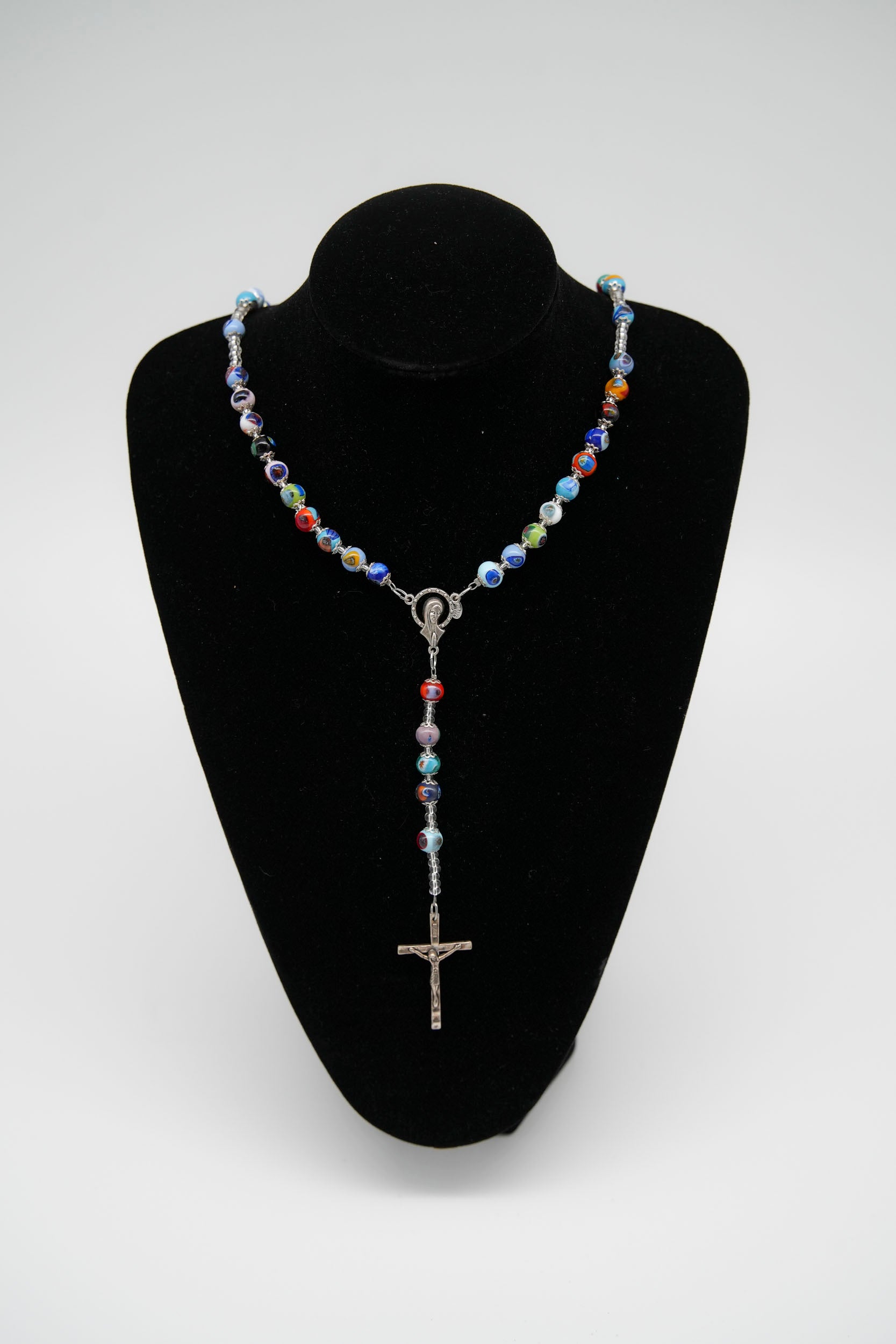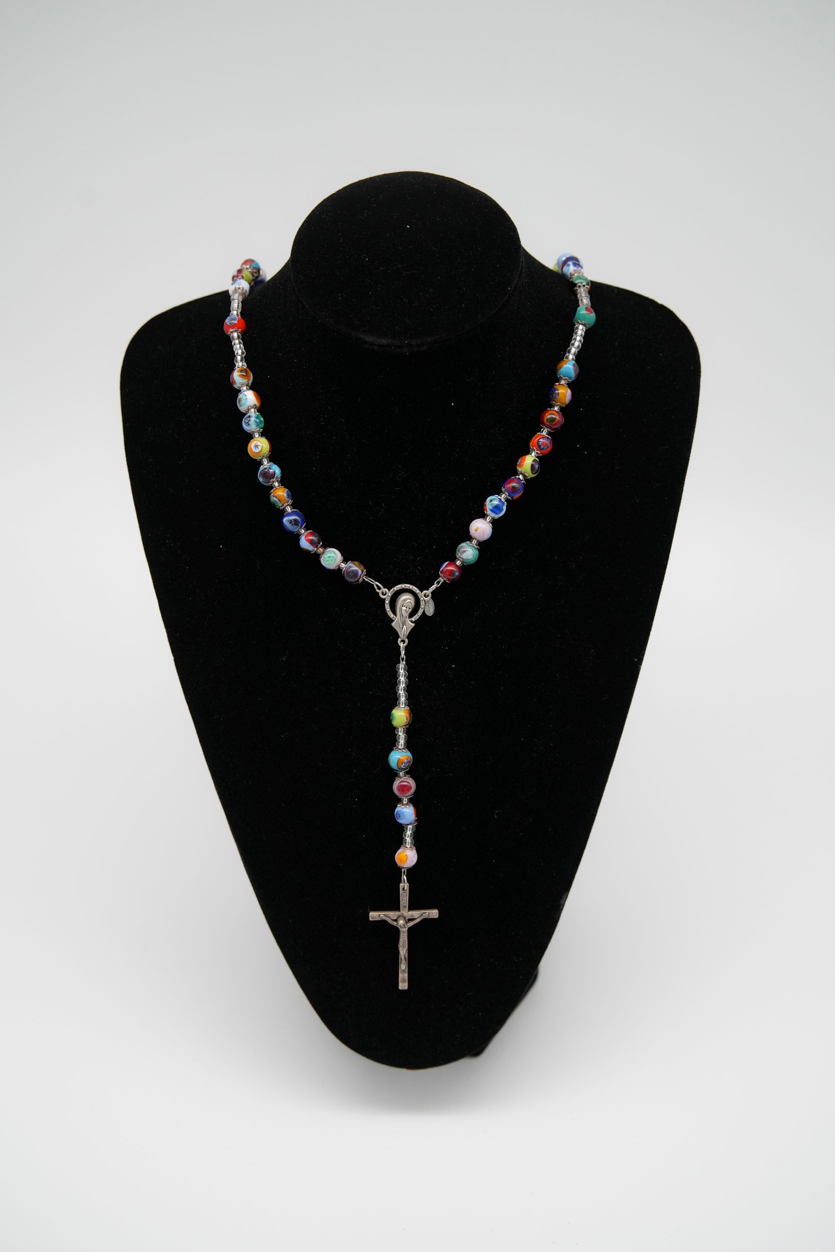 Collana rosario con crocifisso in metallo, realizzata con eleganti perline in vetro di Murano lavorate a mano. Ogni perlina è unica, caratterizzata da vivaci sfumature e motivi multicolore tipici della tradizione veneziana.