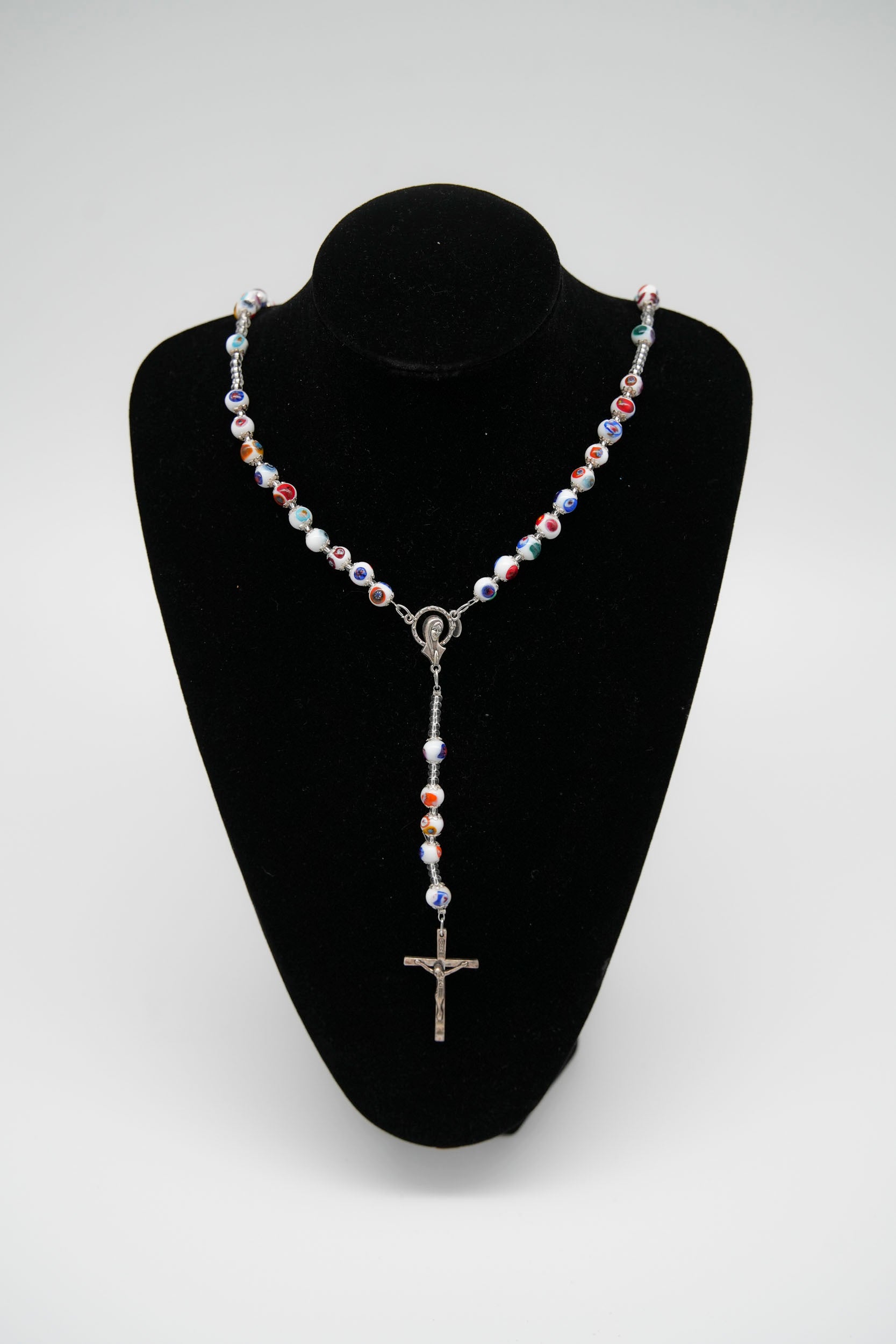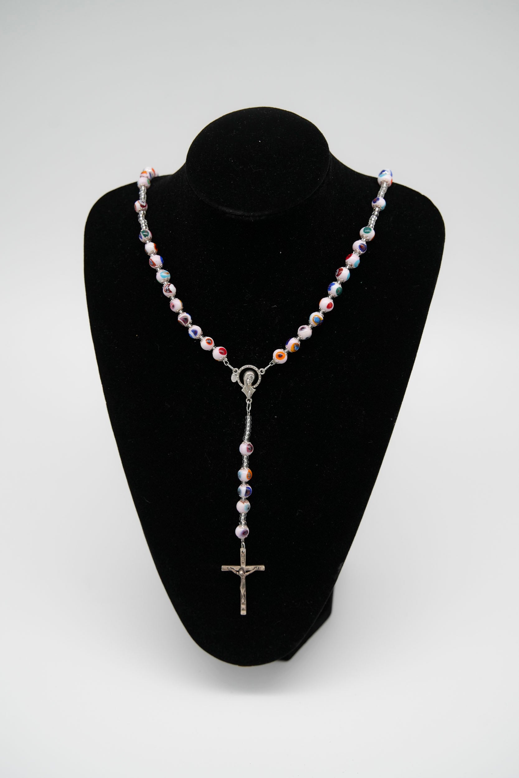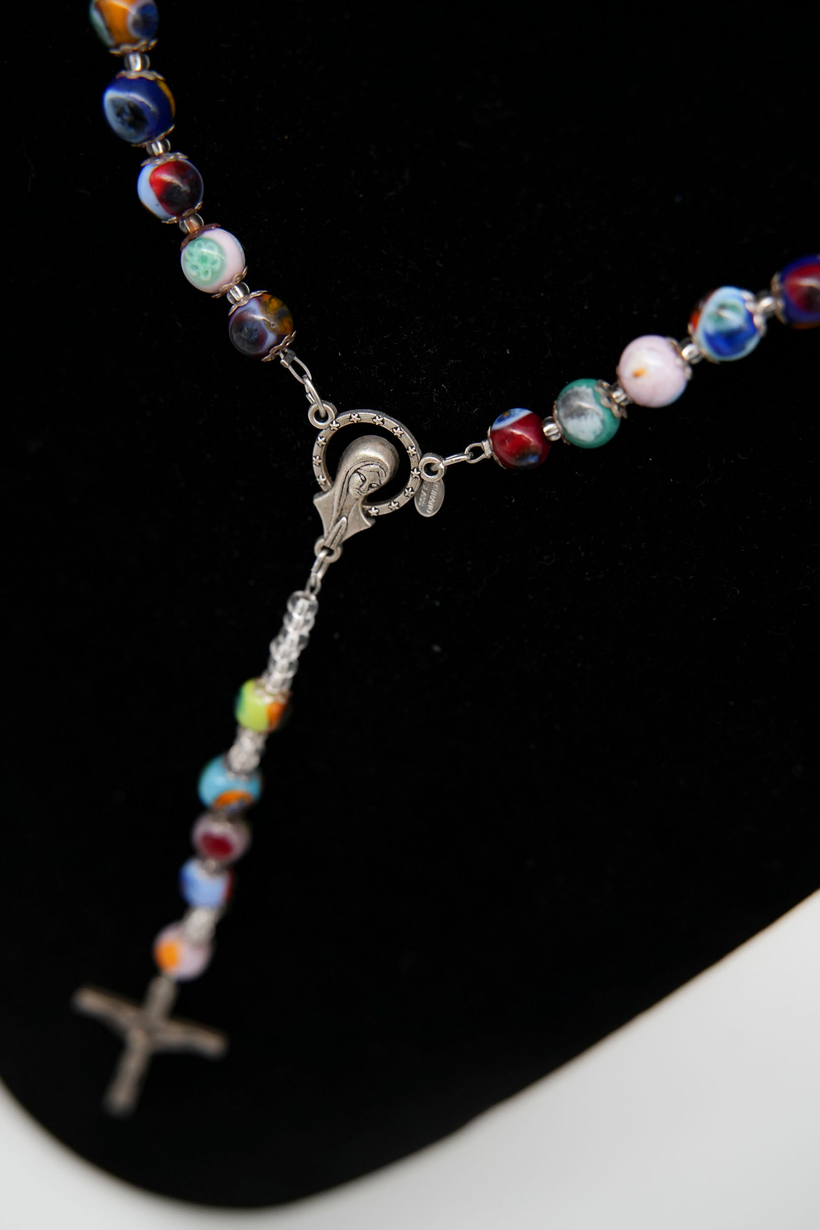 Collana rosario con crocifisso in metallo, realizzata con eleganti perline in vetro di Murano lavorate a mano. Ogni perlina è unica, caratterizzata da vivaci sfumature e motivi multicolore tipici della tradizione veneziana.