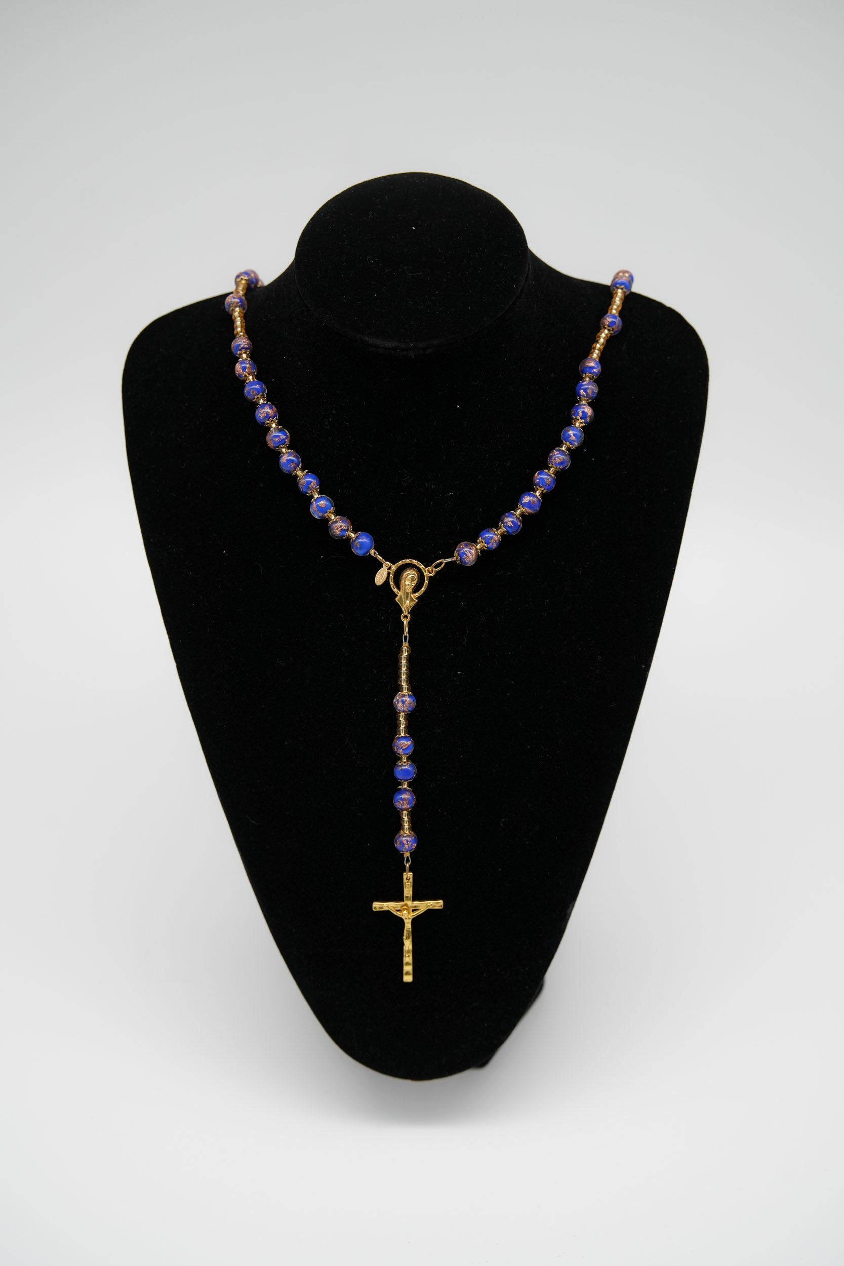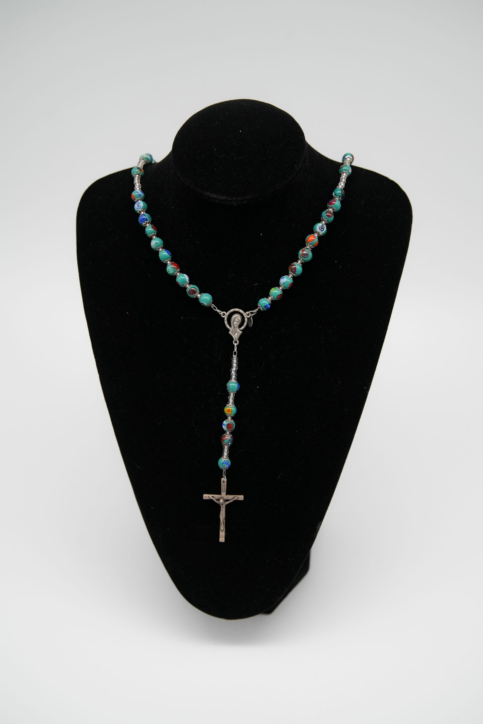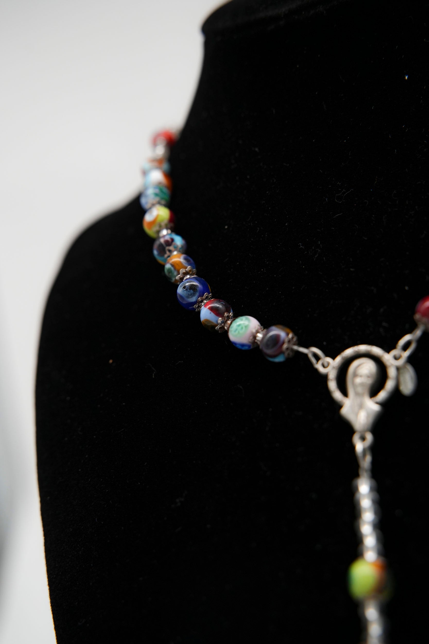 Disponibile in diverse colorazioni, questa collana unisce il valore spirituale al fascino artigianale del vetro muranese, diventando un accessorio prezioso sia da indossare che da regalare.