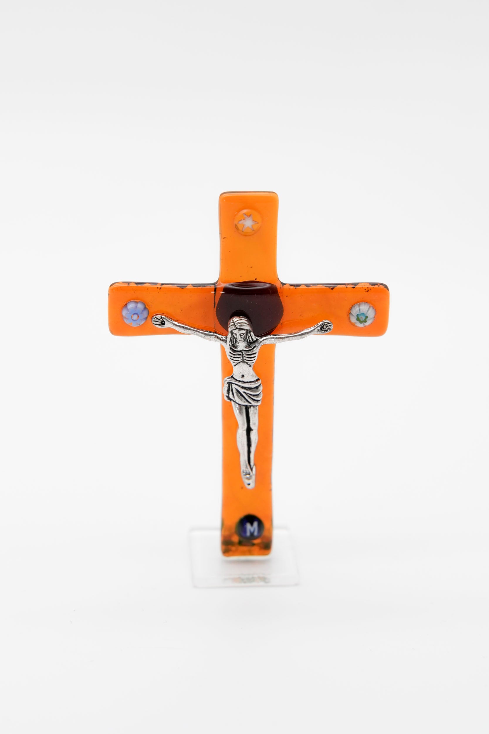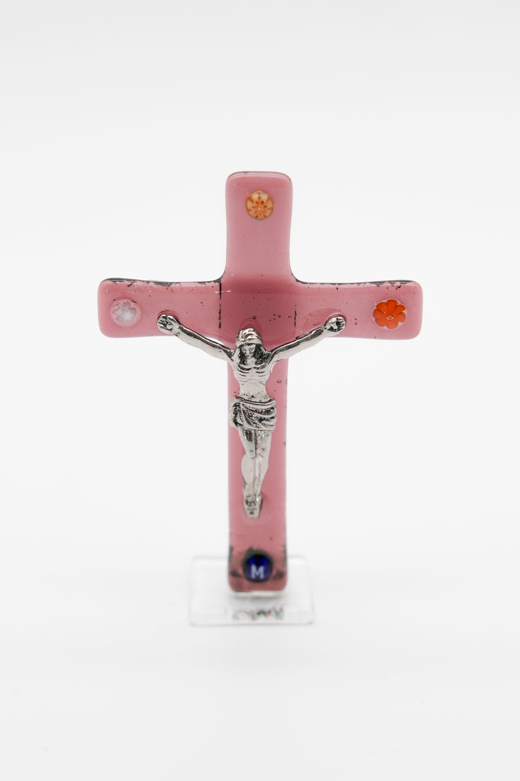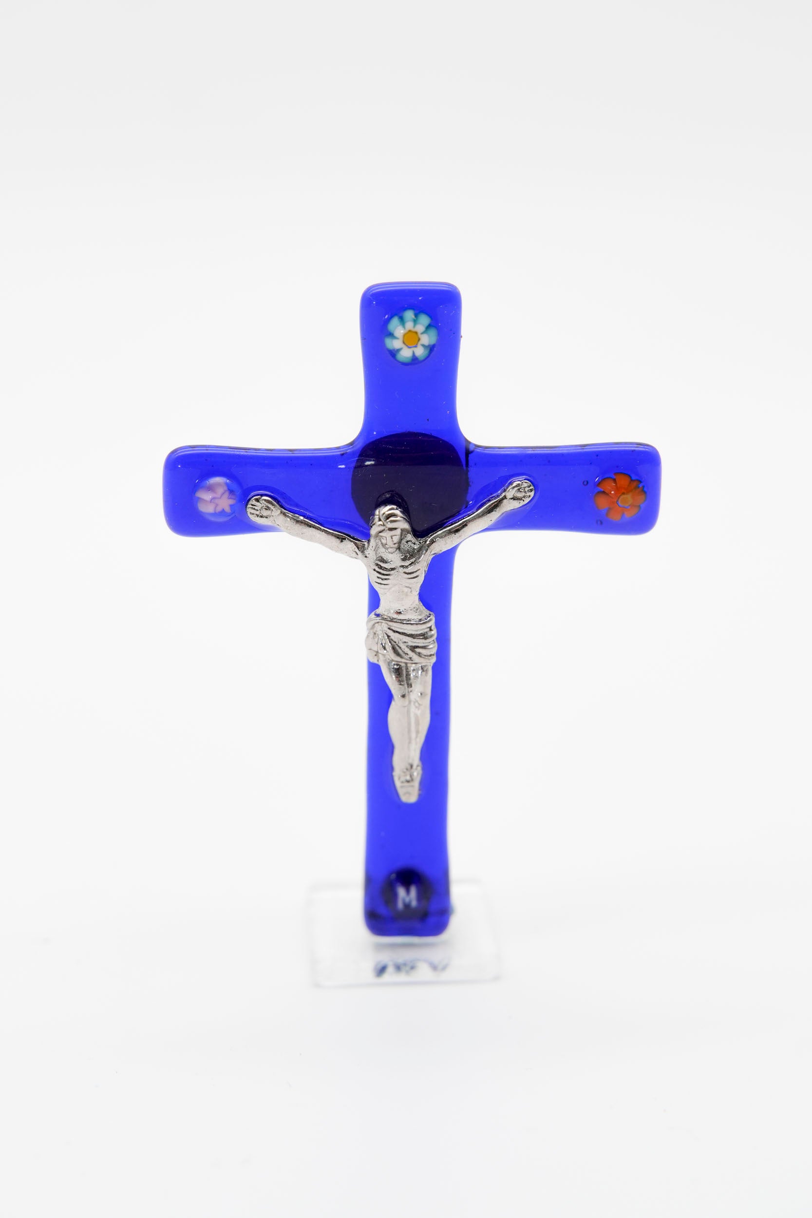 Il Crocifisso Splendore di Murano è una creazione artigianale unica, realizzata in vetro di Murano con dettagli policromi e applicazioni floreali in murrina. Ogni crocifisso è impreziosito da un Cristo argentato applicato a mano, che conferisce profondità e sacralità alla composizione.