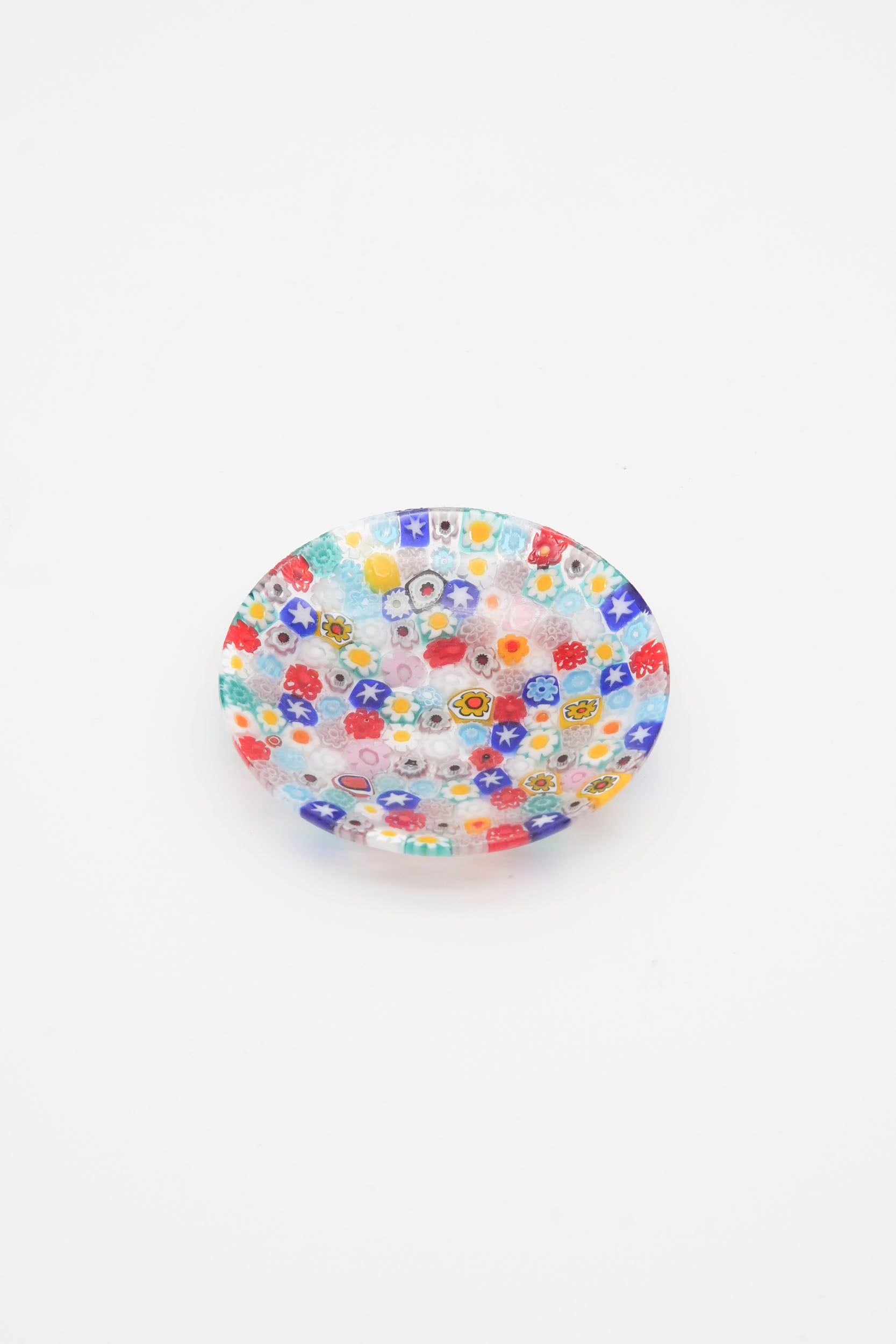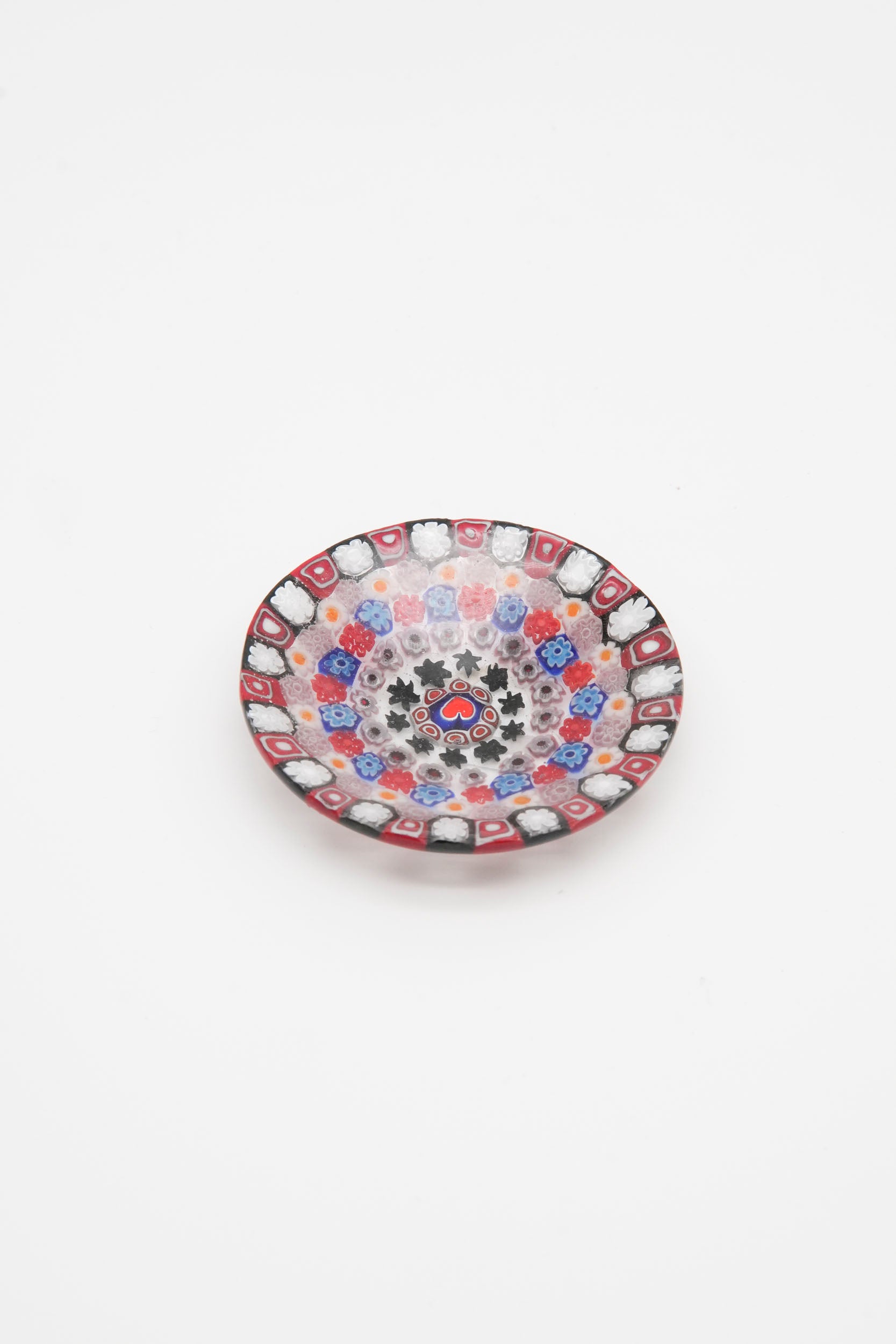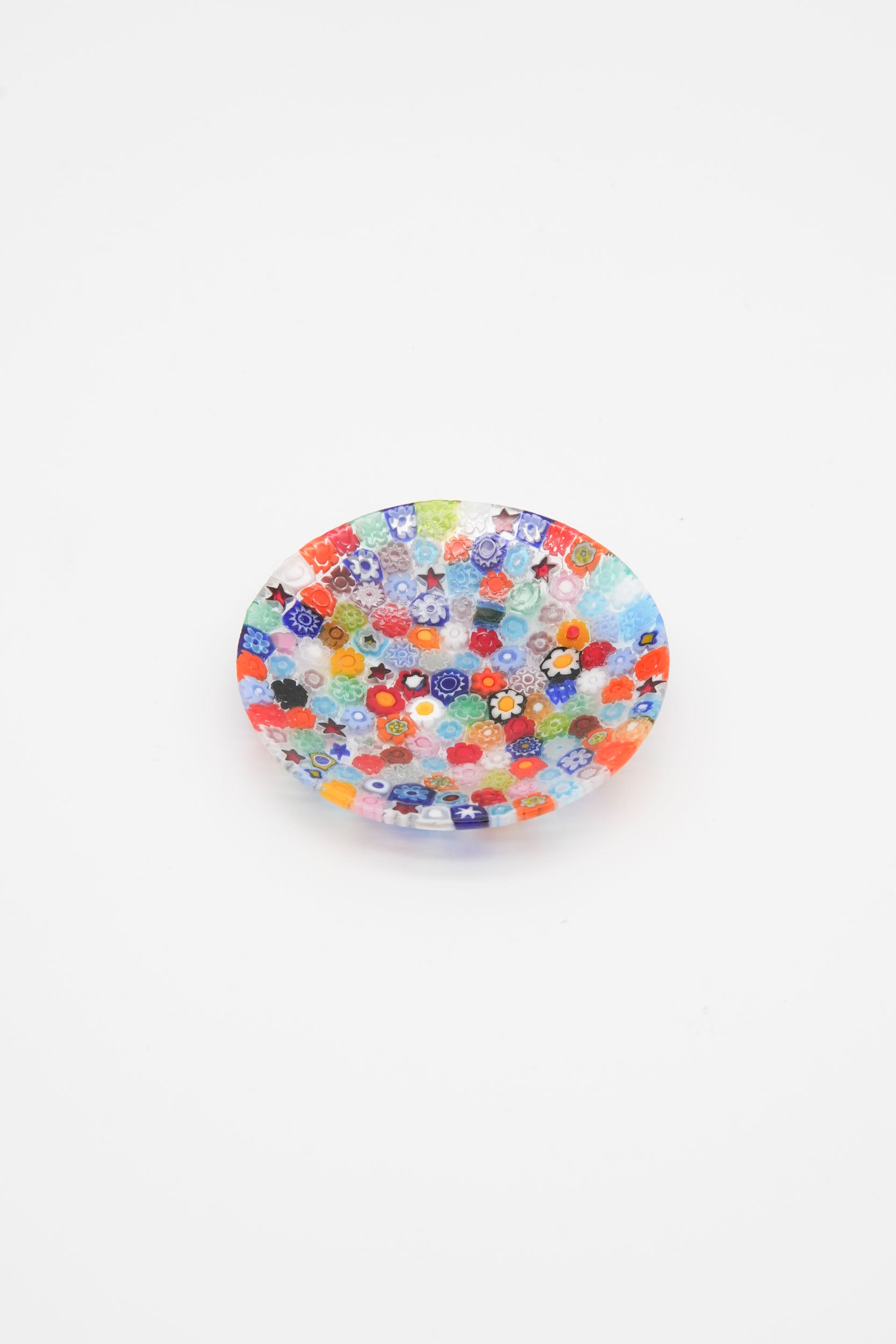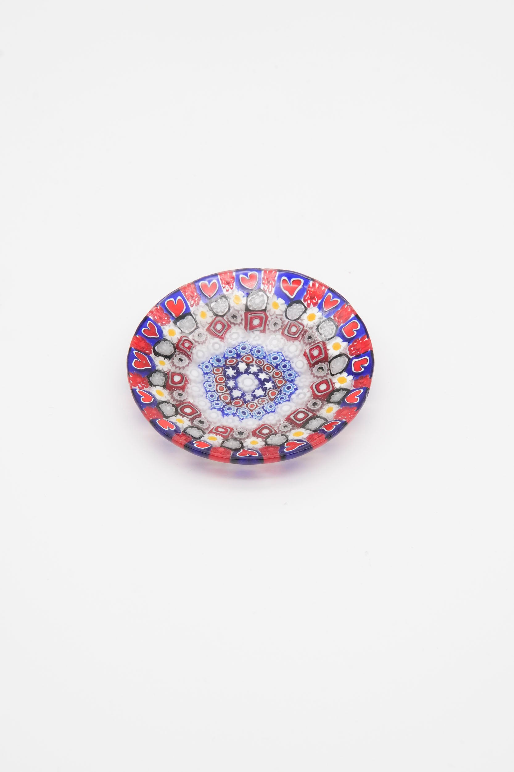 Elegante piattino artigianale in vetro, realizzato con la tecnica delle murrine. Il design presenta una composizione armoniosa di colori che donano al pezzo un aspetto vivace e raffinato.