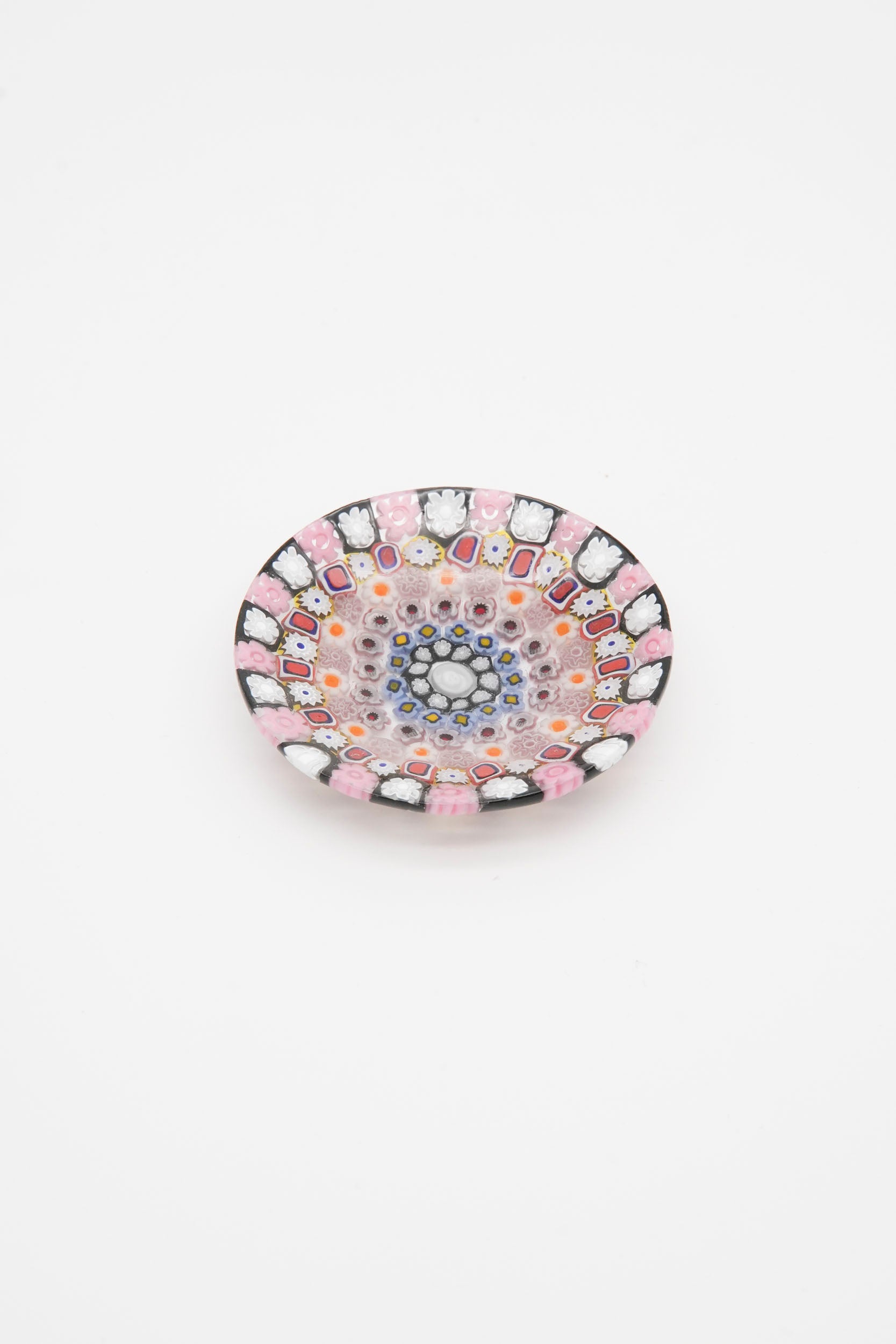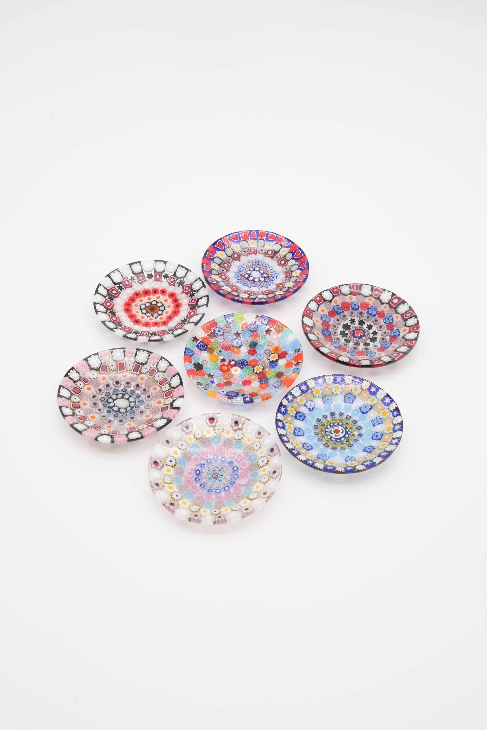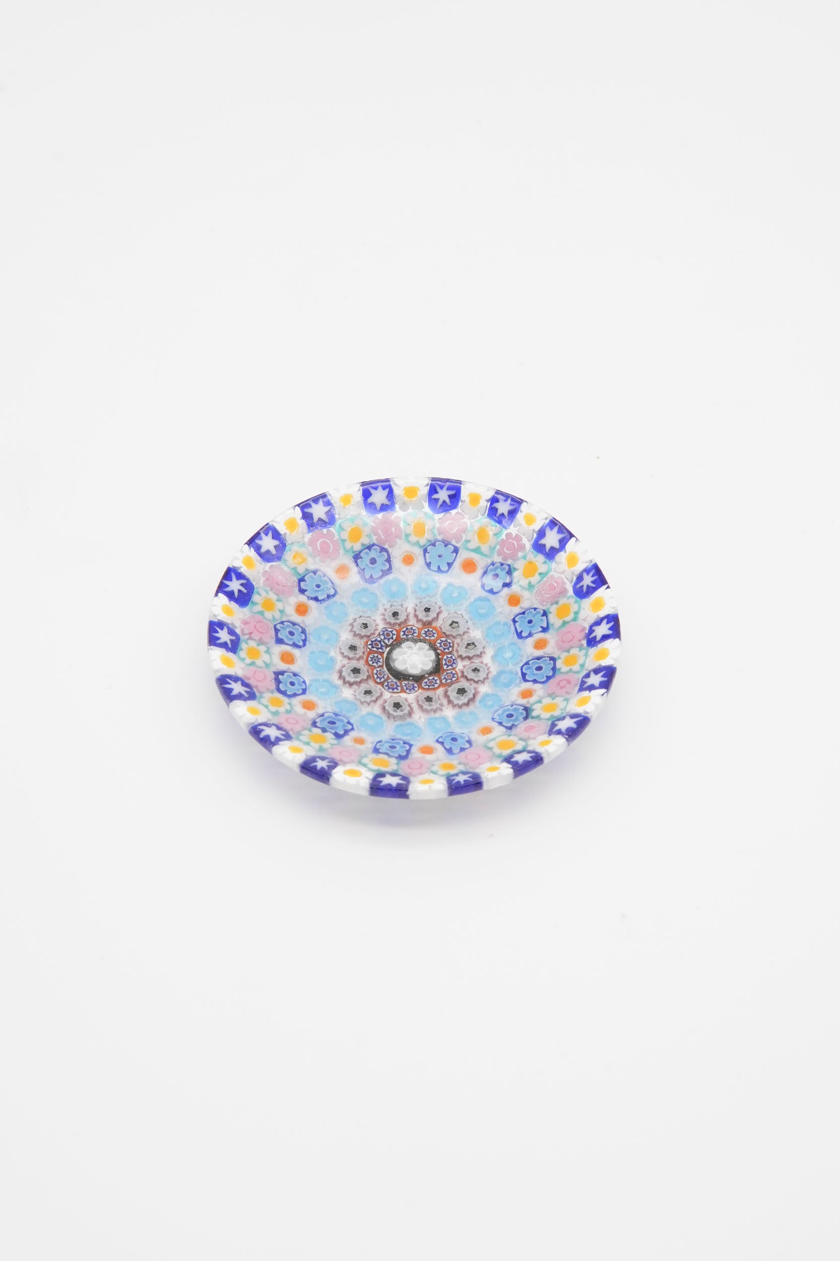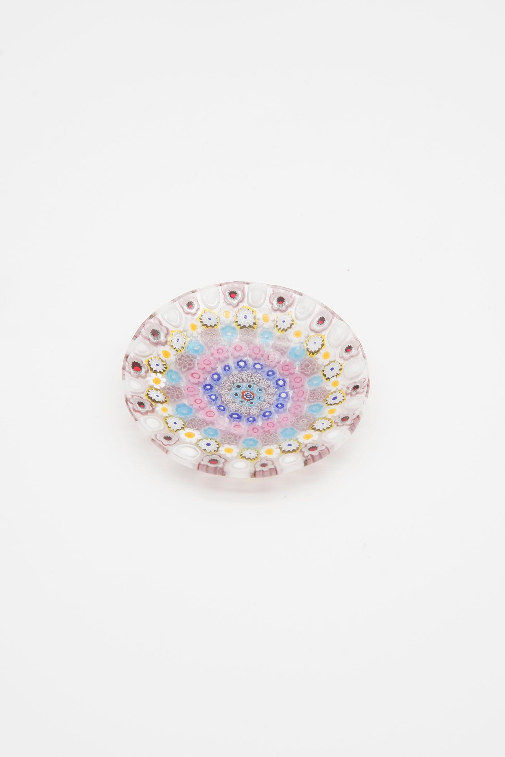 Elegante piattino artigianale in vetro, realizzato con la tecnica delle murrine. Il design presenta una composizione armoniosa di colori che donano al pezzo un aspetto vivace e raffinato.