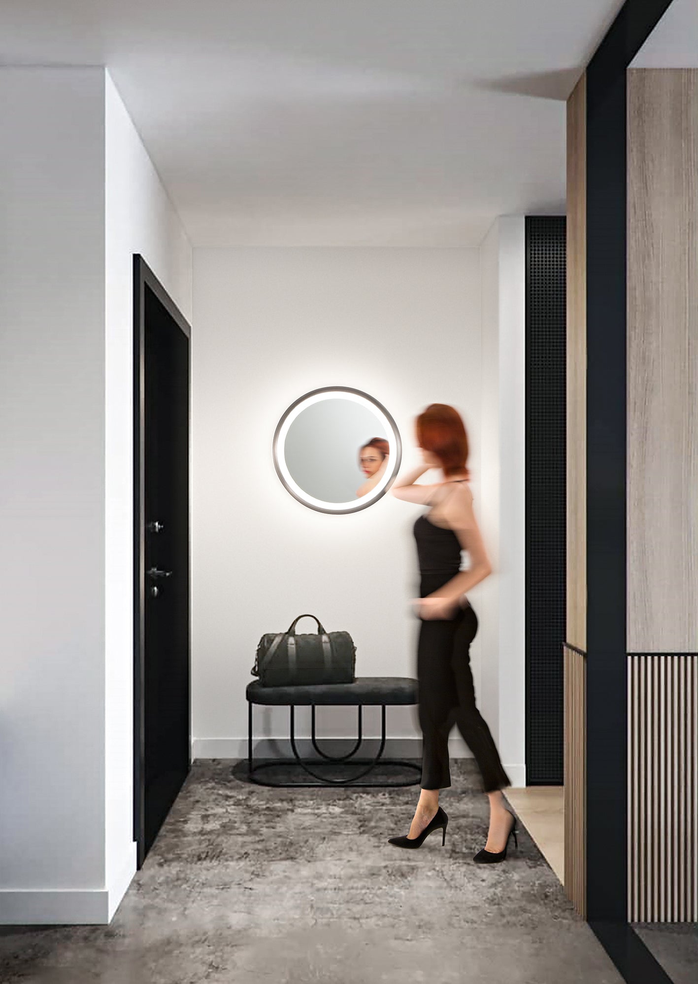 Applique rotondo retroilluminato con luce LED integrata, perfetto per donare profondità e stile agli ingressi moderni. Linee essenziali e design pulito si fondono con l’arredo per un effetto elegante e funzionale.