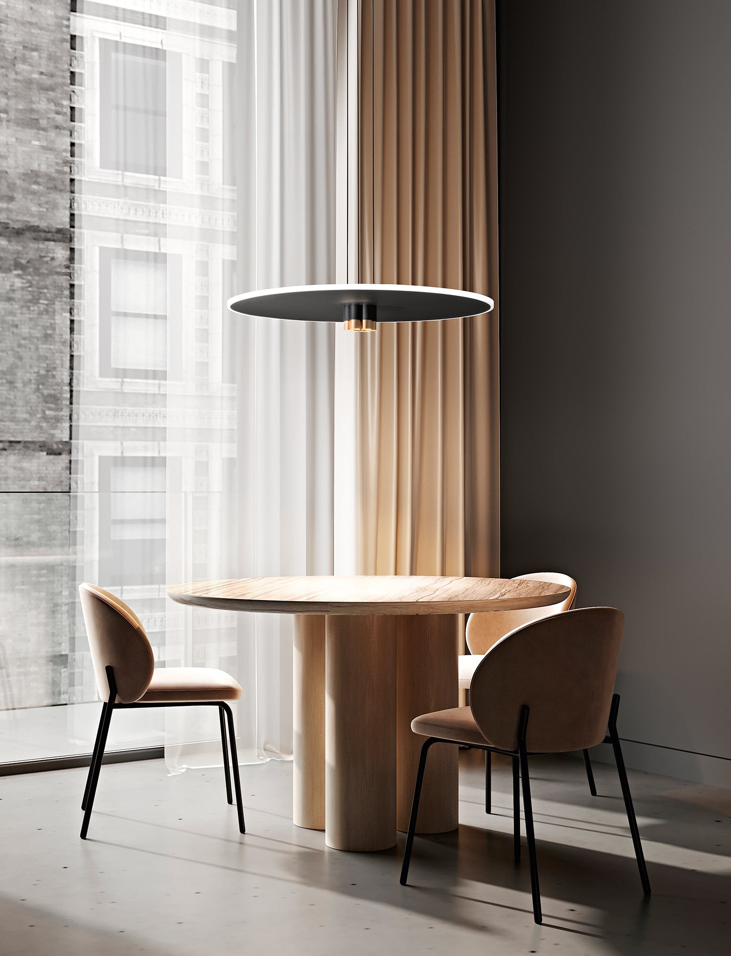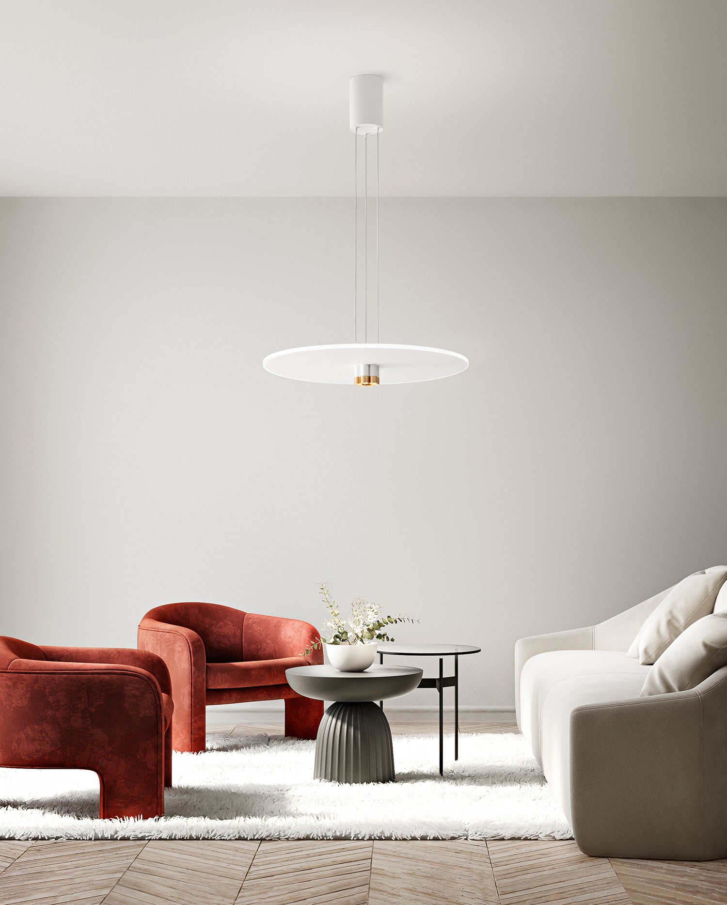 Sospensione Stream con una struttura essenziale e sei faretti integrati nella parte inferiore, è pensata per offrire un’ illuminazione diretta e personalizzabile.
